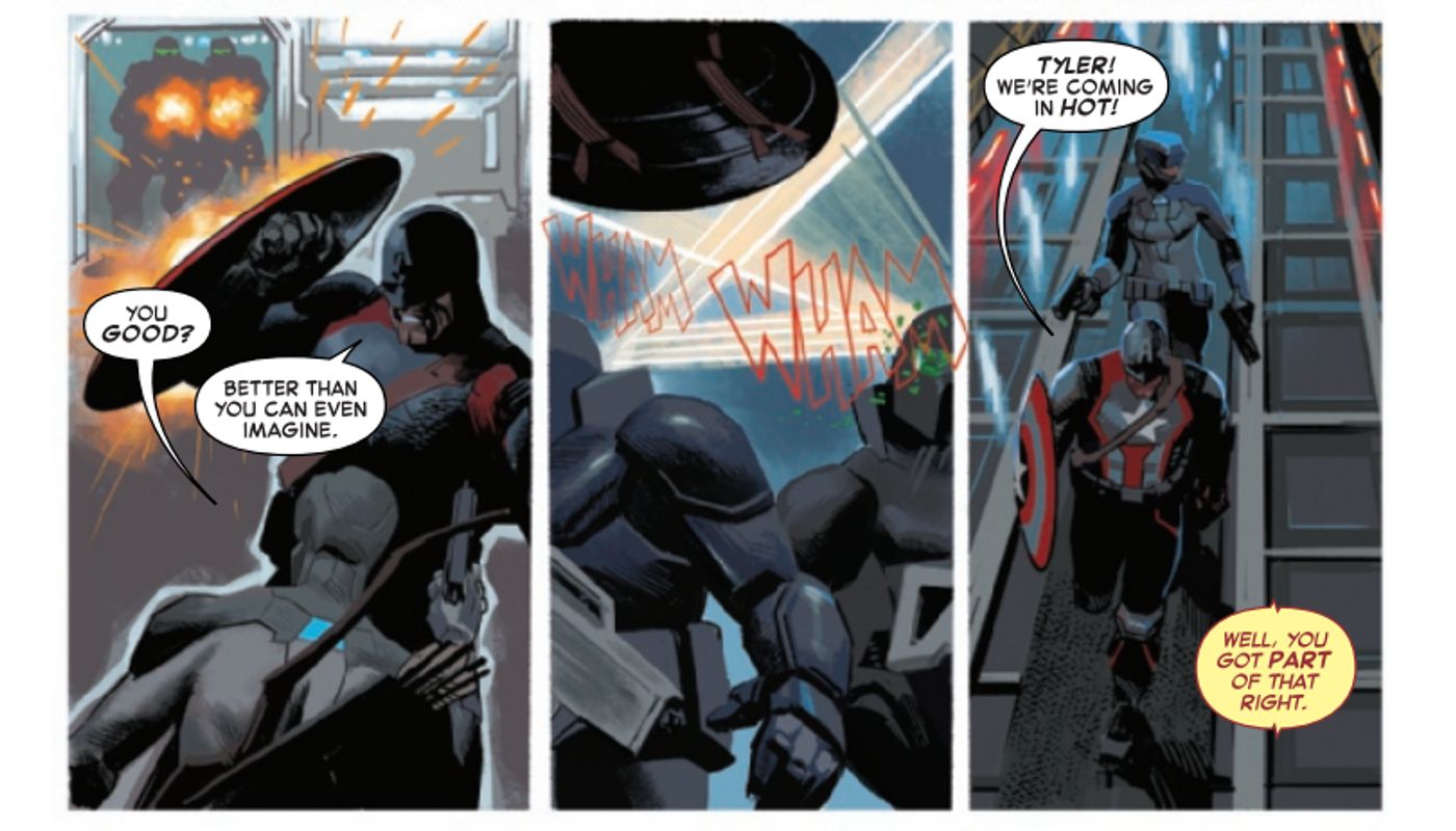 En Vengadores: Crepúsculo #3 Por Chip Zdarsky y Daniel Acuña, el Capitán América se encuentra con Bullseye en The Raft mientras intenta liberar a Tony Stark. Bullseye termina poniéndose del lado de Steve luego de un altercado con el hijo de Tony Stark, James, y escolta a Cap a un lugar seguro. Sin embargo, antes de que los dos se vayan, Bullseye lleva a Cap a desviarse para hacer que Steve “un poco mas completo.” El propósito de este desvío es reunir finalmente a Steve con su escudo original de sus días como Vengador. Sin embargo, lo que dice sobre el escudo hace que este momento sea aún más entrañable.