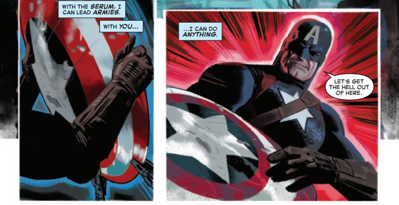 Steve en realidad reconoce que el suero pudo haberlo ayudado a liderar, pero el escudo en sí es mucho más importante para la identidad del Capitán América. “Con el suero puedo liderar ejércitos. Contigo... I poder hacer cualquier cosa“, piensa al escudo, dejando claro que El Capitán América es más poderoso con el escudo que sin él..