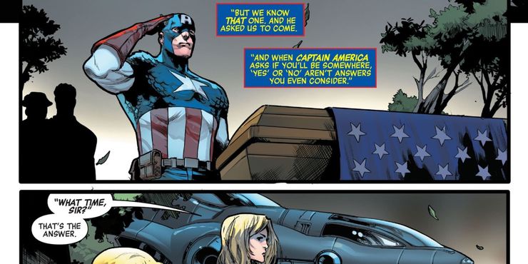 Cuando Starbrand le pregunta al Capitán Marvel por qué están en el funeral dado que no conocían a la persona que murió, el Capitán Marvel simplemente dice que están allí porque el Capitán América les pidió que estuvieran allí. El Capitán Marvel le dice a Starbrand, “Cuando el Capitán América te pide que estés en algún lugar, ‘sí’ o ‘no’ no son respuestas que siquiera consideres. “¿A qué hora, señor?” Esa es la respuesta”. La declaración del Capitán Marvel muestra un profundo respeto por el Capitán América, y su sentimiento va más allá de simplemente asistir a un funeral. El Capitán Marvel esencialmente explicó que no importa dónde el Capitán América necesite a su equipo, estarán allí, ya sea en el campo de batalla, en otro planeta o simplemente en el funeral de un viejo amigo y héroe nacional.