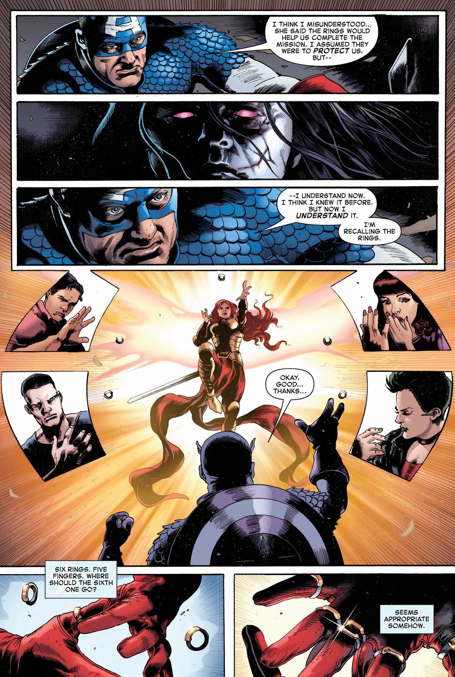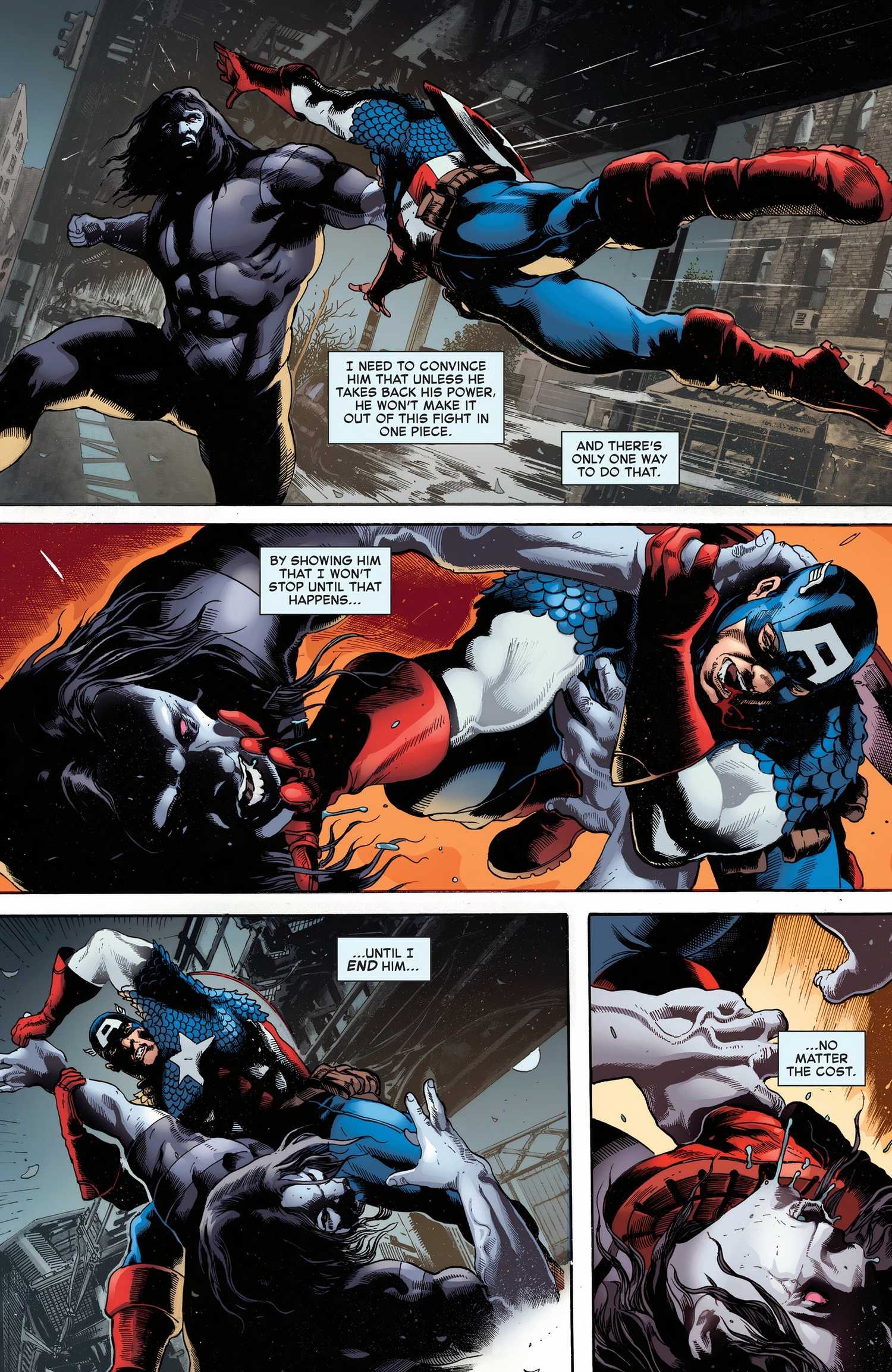 Desde que conoció a Lyra y se vio envuelto en su guerra contra su hermano, la Muerte, Steve Rogers ha estado reclutando Agentes del Cambio para proteger toda la vida en la Tierra. Básicamente, ha entrado en una guerra contra el concepto mismo de la muerte. A primera vista, parece una pelea imposible de ganar, pero la determinación del Capitán América hace que esa palabra carezca de sentido.Y hace lo que mejor sabe hacer: dar un puñetazo. Después de pasar decenas de miles de años como un ser incorpóreo en la Ciudad Pálida, la Muerte no está preparada para manejar un cuerpo humano con tanta habilidad como el Cap, especialmente con la ayuda de los anillos que Lyra le dio a Steve.