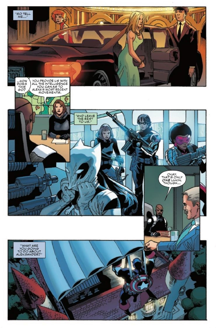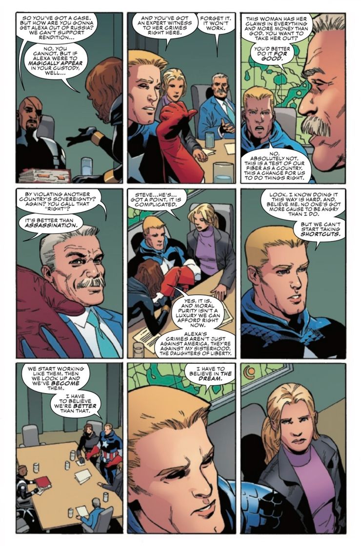Ahora, una vista previa de Marvel Comics para Capitán América # 29 revela que el Capitán América, Nick Fury, el general Ross, el Soldado de Invierno y las Hijas de la Libertad planean pasar a la ofensiva. Sin embargo, mientras Bucky y las Hijas planean perseguir a Alexa Lukin de Power Elite, Rogers se enfrentará a Red Skull directamente al negociar con Aleksander Lukin, el hombre cuyo cuerpo posee el supervillano para difundir su maldad. Disfrute de las páginas de vista previa del próximo número: