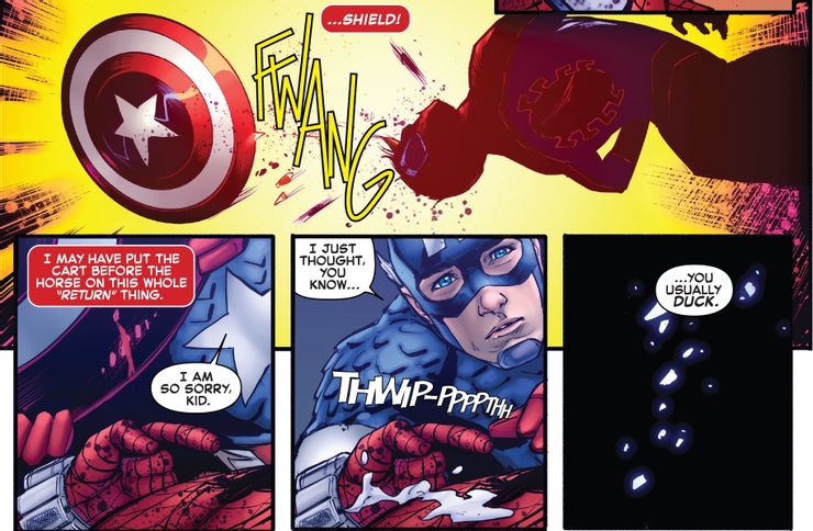 En el último número de Amazing Spider-Man de Marvel Comics, el Capitán América clava al Spider-Man de Peter Parker con un tiro bajo involuntario.