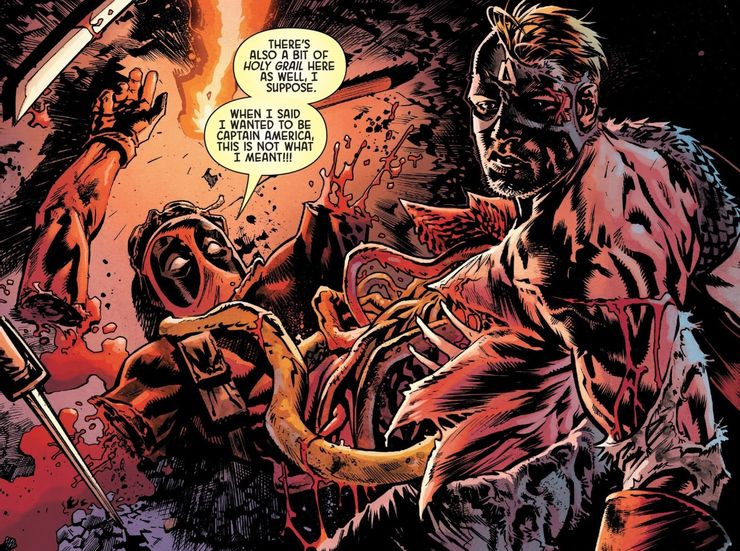 La razón por la que el Capitán América estaba despierto en lugar de congelado como lo estaba en la línea de tiempo principal de Marvel Comics es porque su cuerpo ya fue descubierto por una criatura alienígena que se estrelló en la Tierra antes de que los héroes de Marvel pudieran atraparlo. Ese extraterrestre era aparentemente la misma especie de alienígena que aterrorizó a un equipo de científicos y sobrevivientes en John Carpenter. La cosa película. Después de que el Capitán América mata a Colossus, Deadpool corre tras él después de que Cap se retira dentro de una base cercana. Deadpool rápidamente es asimilado por la Cosa del Capitán América y Iron Man mata en lo que se convirtió Deadpool quemándolo con su lanzallamas, demostrando aún más que este extraterrestre es de la misma especie que el de la película de John Carpenter. En un último homenaje a la película. La cosael Capitán América y Iron Man se encuentran paralizados y Cap le pregunta a Iron Man: “¿Qué debemos hacer ahora?a lo que Iron Man responde:¿Por qué no esperamos aquí un rato? Mira qué pasa.” Este es casi exactamente el mismo diálogo hablado por los personajes de Kurt Russell y Keith David en la película.