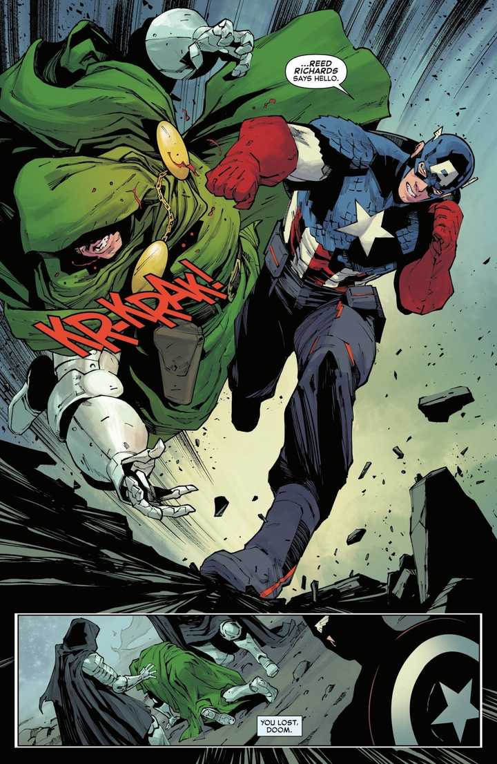 En Capitán América #4, el Capitán América ignora los elogios del Doctor Doom y se quita la máscara para revelar el rostro humano del villano debajo. Cap revela que el propio Reed Richards le aconsejó que hiciera esto, ya que la humanidad de Doom es su mayor vulnerabilidad. Para enfatizar la humillación de Doom, Cap golpea a Doom directamente en la cara y le dice: “Reed Richards saluda“.