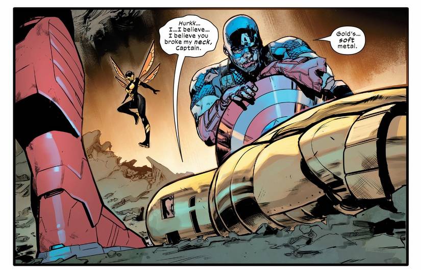 Tras lograr cortar la fuente de energía de Midas, el resto del equipo distrae a su enemigo mientras Cap usa su escudo para romperle el cuello a Midas a través de su armadura. Y cuando se arrodilla sobre su enemigo derrotado, todo lo que Steve tiene que decir es: “El oro…suave metal.”