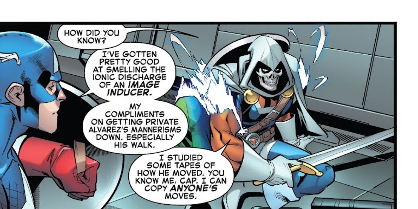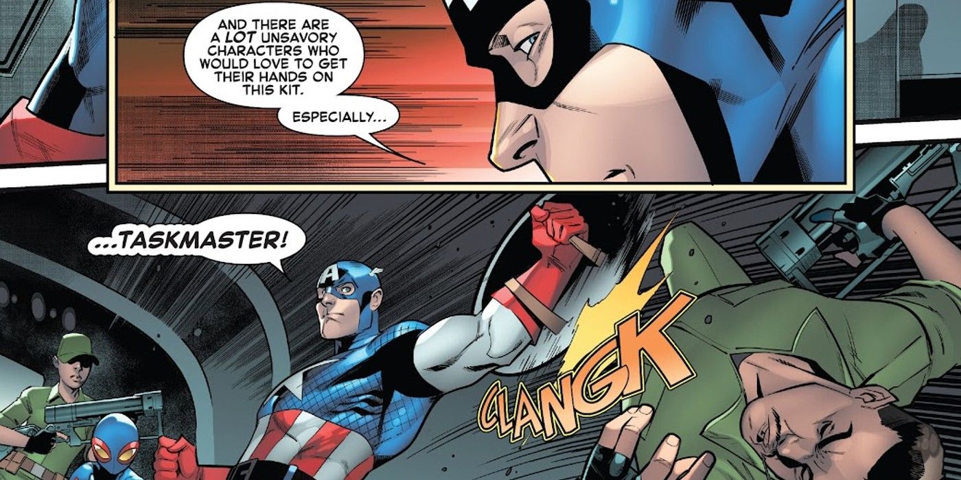 Los dos unen fuerzas para enfrentarse al Taskmaster, con Cap literalmente olfateando al villano. Resulta que Steve Rogers puede detectar a Taskmaster porque su sentido del olfato es lo suficientemente fuerte como para oler la descarga iónica que Taskmaster exuda de su tecnología de disfraz.