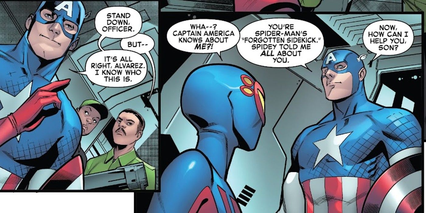 La versión de Spider-Boy de Spider-Sense es una habilidad psíquica; El joven Bailey Briggs tiene la sensación de que alguien cercano estará en peligro inminente y necesitará ayuda, sin decirle quién es el individuo en peligro. chico araña El número 2 lleva al héroe novato directamente al camino del Capitán América. Después de encontrar a Steve y a dos soldados que lo acompañaban en un vuelo en helicóptero. Spider-Boy dice que cree que Cap es la persona a la que se supone que debe salvar. Debido a que el trabajo de ser un superhéroe conlleva peligro, Steve no está preocupado, pero entiende que lo que está haciendo probablemente podría merecer la atención de un supervillano.