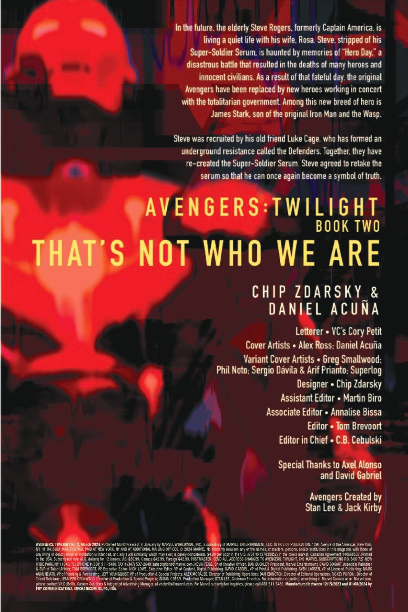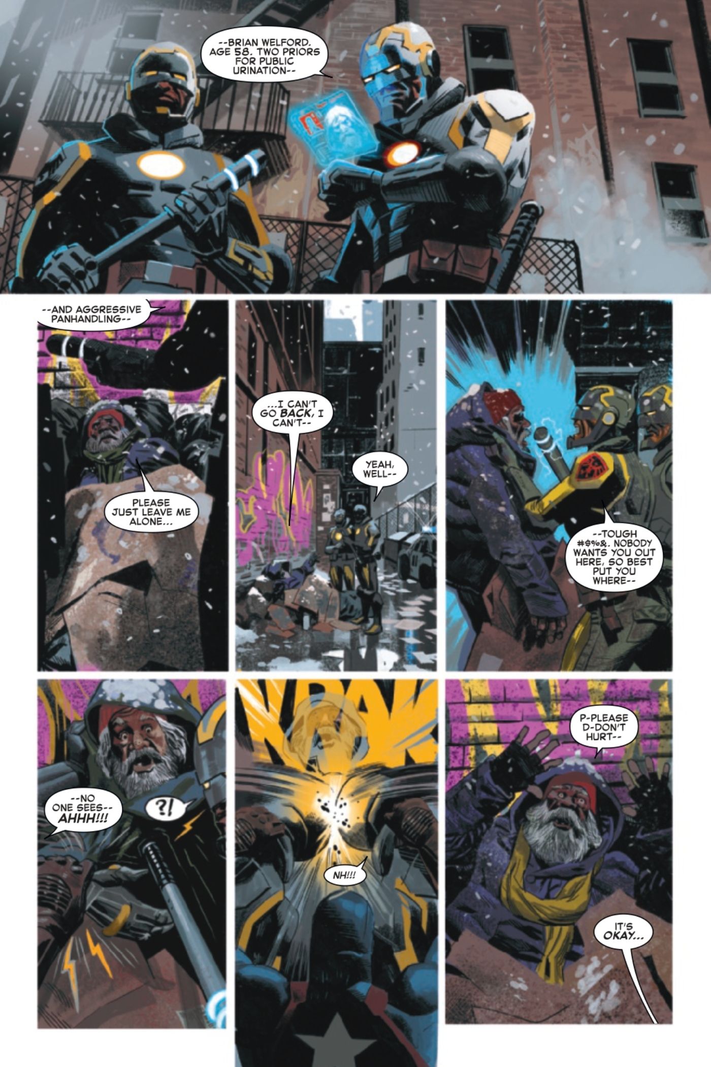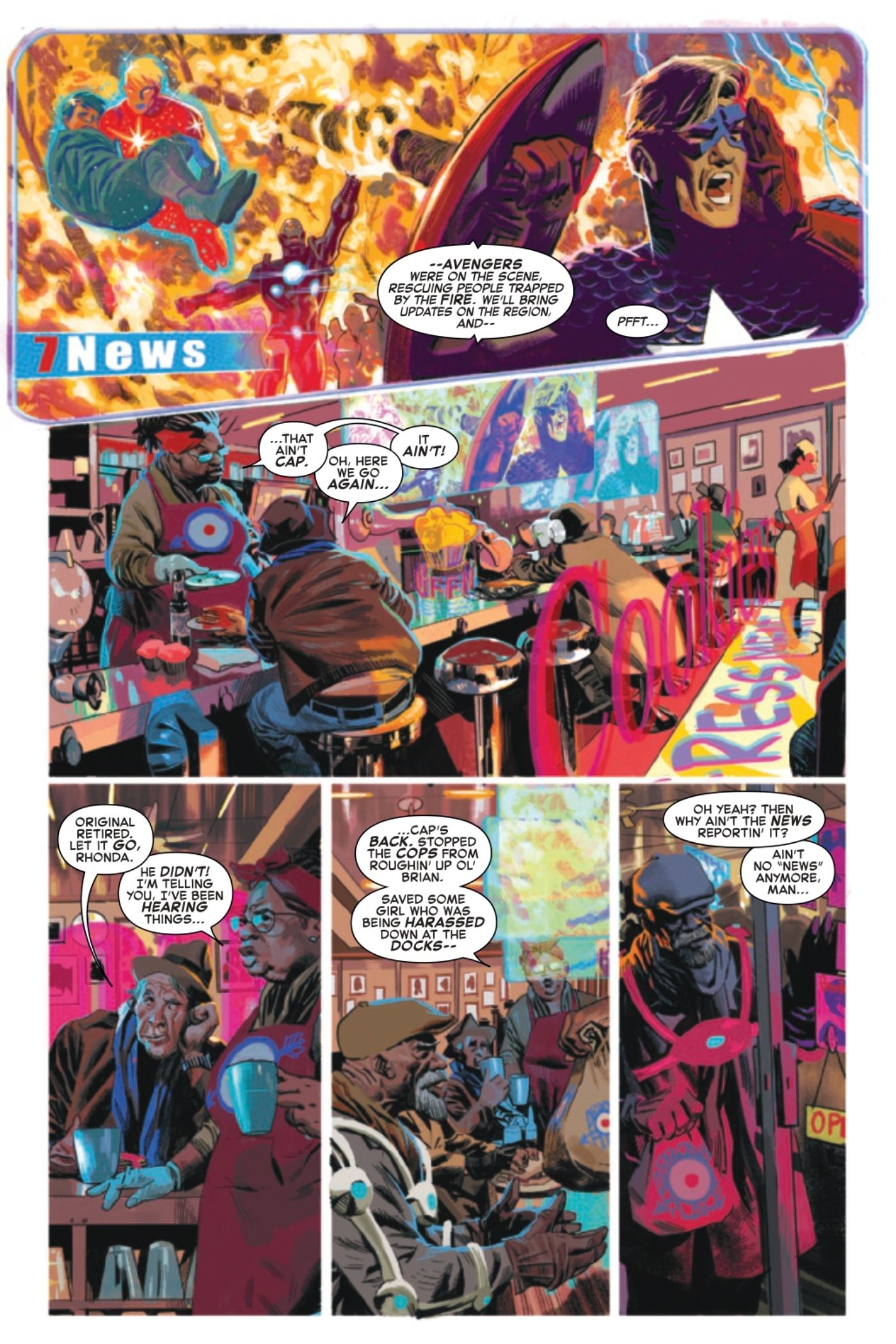 En un adelanto de Vengadores: Crepúsculo #2 de Chip Zdarsky y Daniel Acuña, el Capitán América ha salido a las calles, luchando contra agentes de la ley corruptos que aterrorizan injustamente a los civiles. Esto se produce después de que el ahora anciano Steve Rogers, a quien le quitaron sus mejoras sobrehumanas antes de los eventos de esta serie, recuperó sus poderes al final del número anterior, y ahora los está usando para luchar una vez más por la verdad y la justicia.