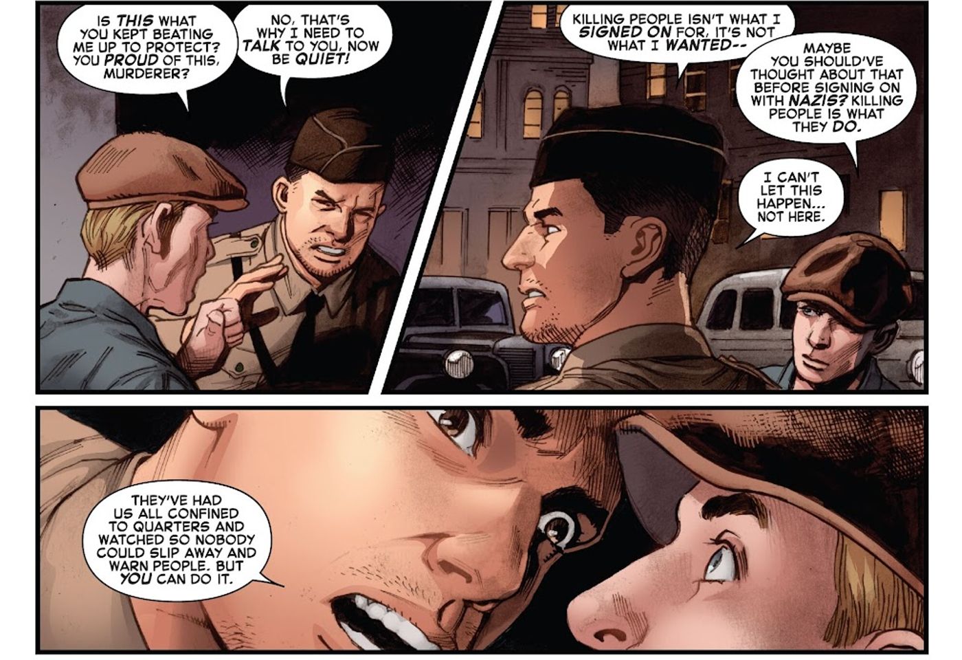 En Capitan America #5 – por J. Michael Straczynski, Lan Medina, Espen Grundetjern y Joe Caramagna – un flashback muestra el pre-suero de Steve Rogers, intentando frustrar el bombardeo de bandera falsa de un mitin nazi. Huye después de descubrir el complot, apenas logra salir con vida, sólo para regresar con Meyer Lansky y sus hombres para evitar el desastre.