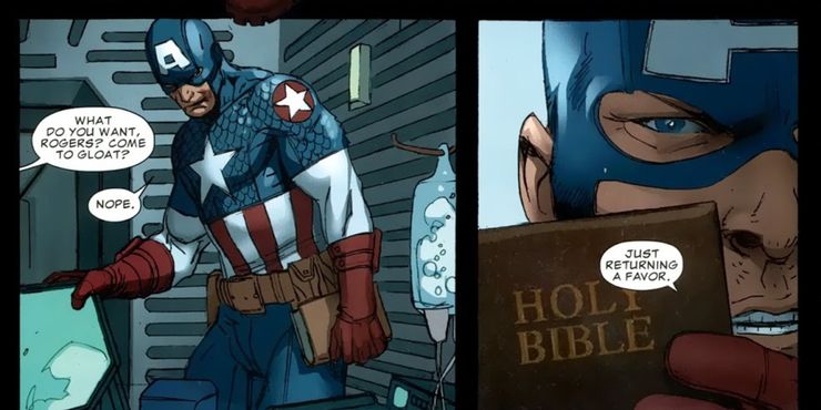 Aunque ya lo había derrotado, Capitan America torturó a uno de sus reemplazos más oscuros, Nuke, con la Biblia en el universo Ultimate. Después de sobrevivir semanas siendo prisionero de Nuke, Steve Rogers había soportado todo tipo de tortura física, emocional y psicológica con la esperanza de romper su espíritu y ayudarme a ver “la Luz”. A pesar del dolor y la angustia, Rogers no se quebró y luego, cuando se cambiaron las tornas, decidió devolver el favor pero a su manera.