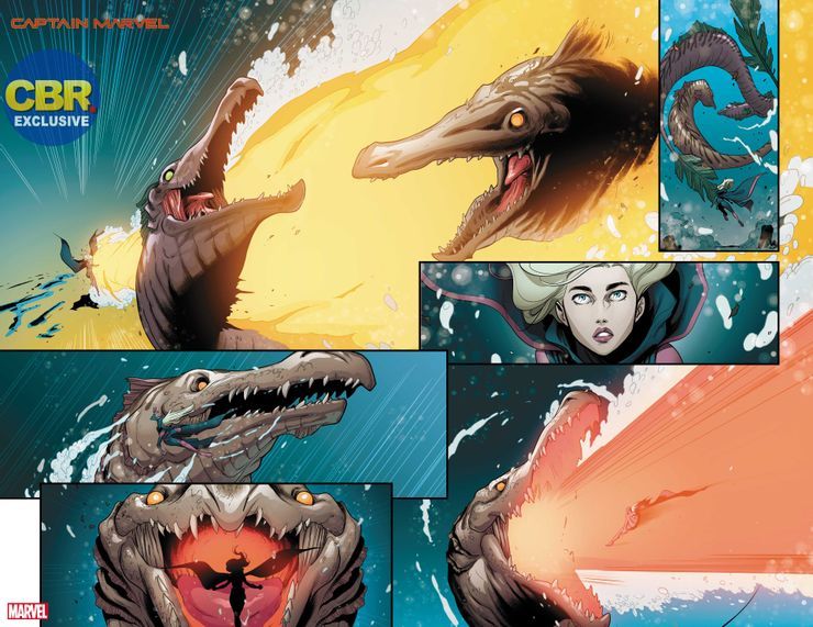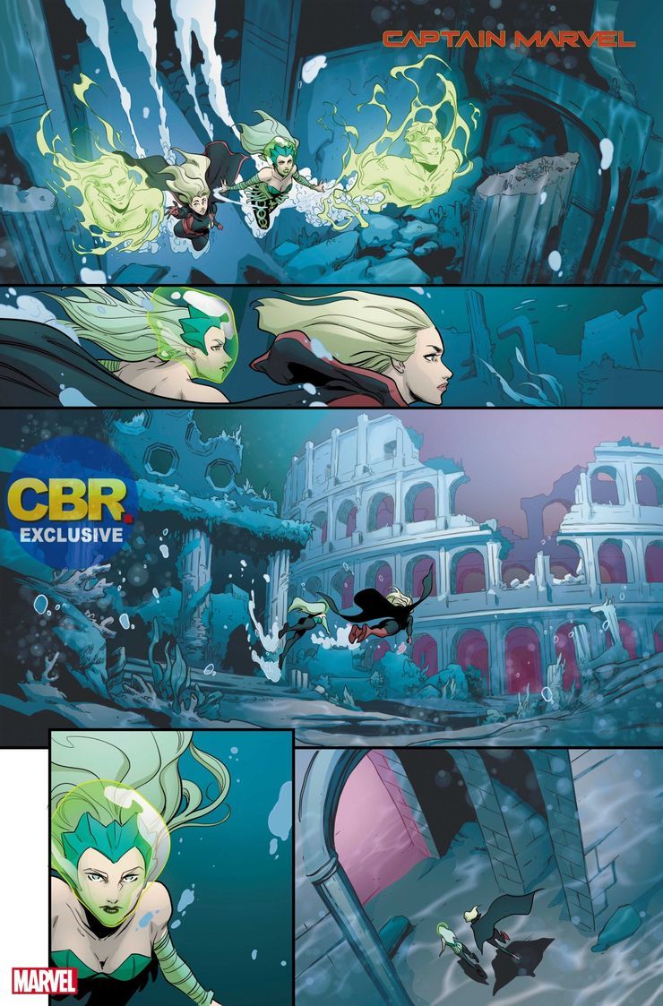 En una nueva vista previa de CBR para Capitán Marvel # 30 de Kelly Thompson, Jacopo Camagni y Espen Grundetjern, Carol viaja con Enchantress bajo el mar. No está claro si la Hechicera sabe de la llegada de su futuro hijo, pero parece que no se da cuenta ya que está ayudando a Carol en su búsqueda para encontrarlo. ¿Quizás ya llegó a Atlantis y / o se presentó a Namor? Las imágenes de vista previa muestran al Capitán Marvel atravesando el agua y encontrando una criatura gigante en el camino.