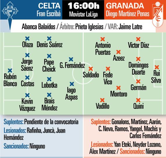 Por su parte, el Granada visita al Celta con el objetivo de prolongar los buenos resultados logrados a domicilio en este inicio de campeonato, ya que empató en Villarreal en la primera jornada (4-4) y en la pasada ganó en el feudo del Espanyol (0-3).