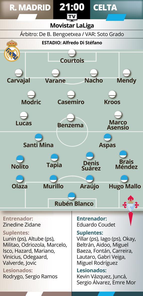 El Celta, por su parte, llega a este duelo en un gran estado de forma. Aspas lidera a este renacido equipo gallego de la mano de Coudet ha dejado de mirar a la parte baja de la tabla para mirar hacia arriba. Además, Denis Suárez ha recuperado su mejor versión alejado de la banda. Nolito parece estar viviendo una segunda juventud, mientras que Brais Méndez y Santi Mina han respondido a la confianza de Coudet. Todos ellos son indiscutibles en un once que se recita de memoria que ha convertido al conjunto gallego en el equipo más en forma del campeonato y que llega al Di Stéfano sin ningún miedo al Real Madrid de Zidane