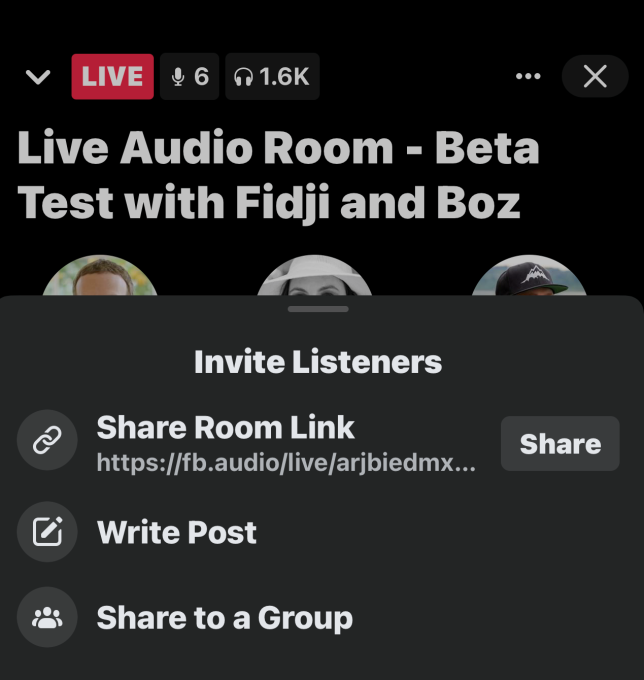 Los oyentes pueden “Me gusta” o reaccionar de otra manera al contenido mientras se transmite en vivo usando el botón “Pulgar hacia arriba” en la parte inferior de la pantalla. Y pueden optar por compartir la Sala de audio en una publicación de Facebook, en un grupo, con un amigo directamente o mediante otras aplicaciones.