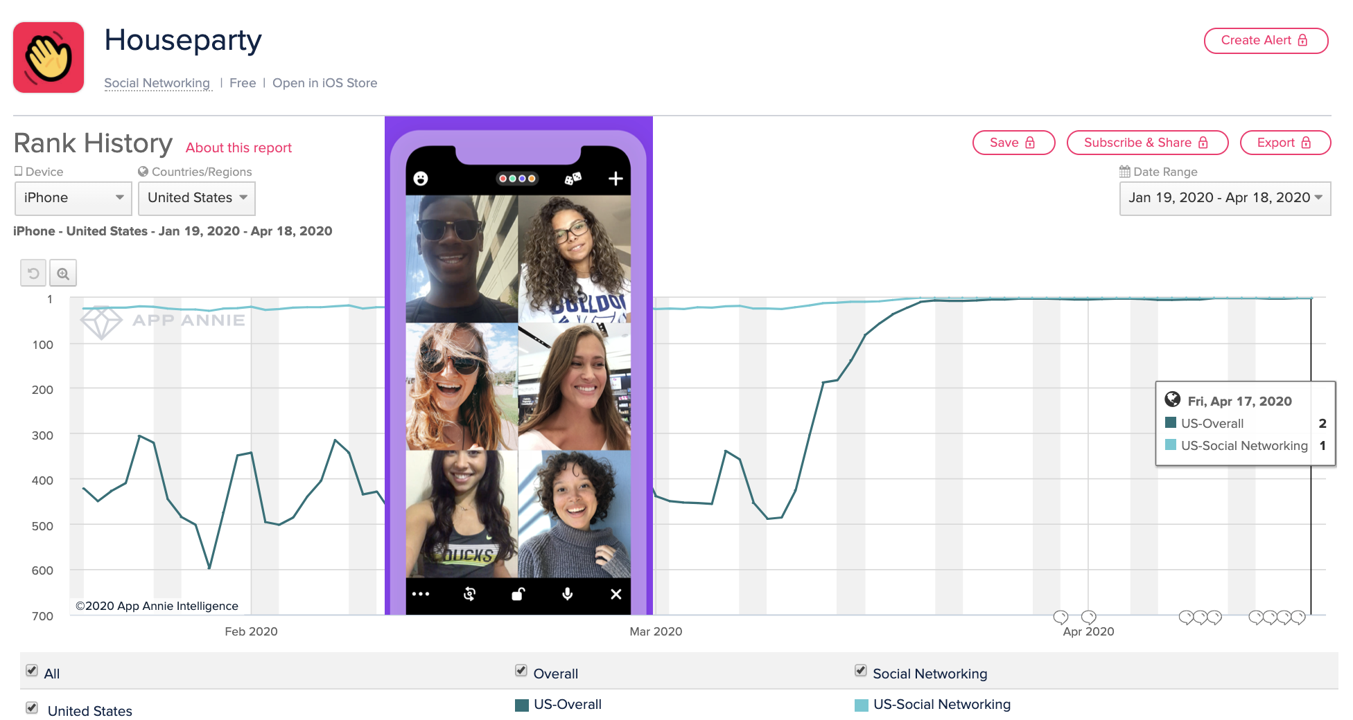 El gráfico de Houseparty se clasifica a través de AppAnnie