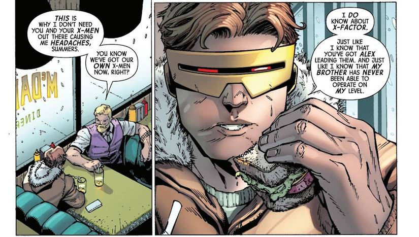 En Ryan Stegman y Jed MacKay X-Men #3Cyclops se enfrenta al Agente Lundqvist de la Oficina de Emergencia Nacional, también conocido como O*N*E. Lundqvist está tratando desesperadamente de mantener el control de la nueva lista de X-Men de Cyclops, especialmente porque los rumores de un “virus mutante” están aumentando las tensiones entre humanos y homo superior. Pero cuando Lundqvist intenta arrojarle a la cara a Cyclops el liderazgo de Havok en X-Factor, Scott Summers responde que está consciente del equipo, tal como está consciente de que “Mi hermano nunca ha podido operar a mi nivel.”