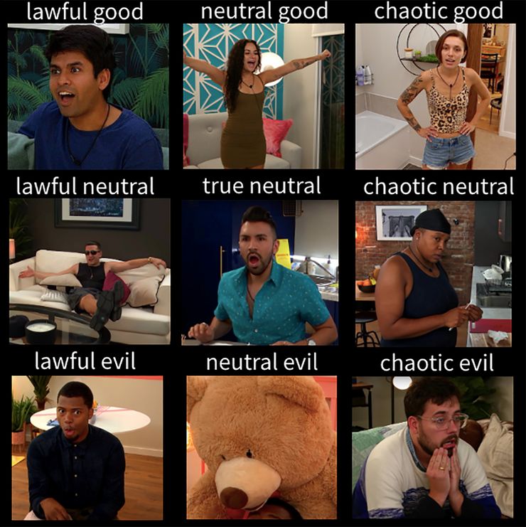 Este práctico cuadro de alineación describe perfectamente a las personas encasilladas que aparecen en el programa cada temporada, desde el jugador caótico pero bueno hasta el jugador neutral pero malvado, el malvado legal, etc.