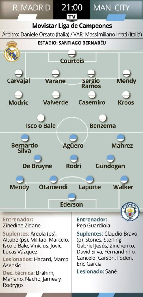 El Manchester City, por su parte, llega a este duelo con la presión de que puede ser su última Champions en los dos próximos años tras la sanción de la UEFA. Guardiola tiene a su disposición a toda la plantilla salvo Mané que no se ha recuperado a tiempo para este partido del Bernabéu. El técnico catalán sacará todo su arsenal ofensivo para tomar el Bernabéu. En defensa es donde el City está teniendo problemas. La vuelta de Laporte, que se perdió por lesión la primera parte de la temporada, ha mejorado defensivamente al equipo inglés que quiere seguir con su inmaculada trayectoria fuera de casa en Champions donde no conoce la derrota.