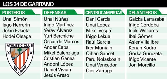 Esa misma cifra de 34 jugadores rores rojiblancos, salvo sorpresa anterior en la puerta de salida, será la que tenga a su disposición el técnico de Derio cuando el conjunto bilbaíno ponga de nuevo en marcha sus motores el próximo 13 de agosto, con previo paso de las pertinentes pruebas médicas entre el 10 y el 12. Los entrenadores suelen comentar que quieren ver a todos en acción antes de tomar las decisiones sobre quién se queda, quién sale prestado, quién no da aún el salto desde el Bilbao Athletic… Aunque, en realidad, las cartas suelen estar marcadas. En el sentido de que ya se conocen los gustos del míster de turno y de que, prácticamente, ya se tiene una idea diseñada sobre la confección de la plantilla.