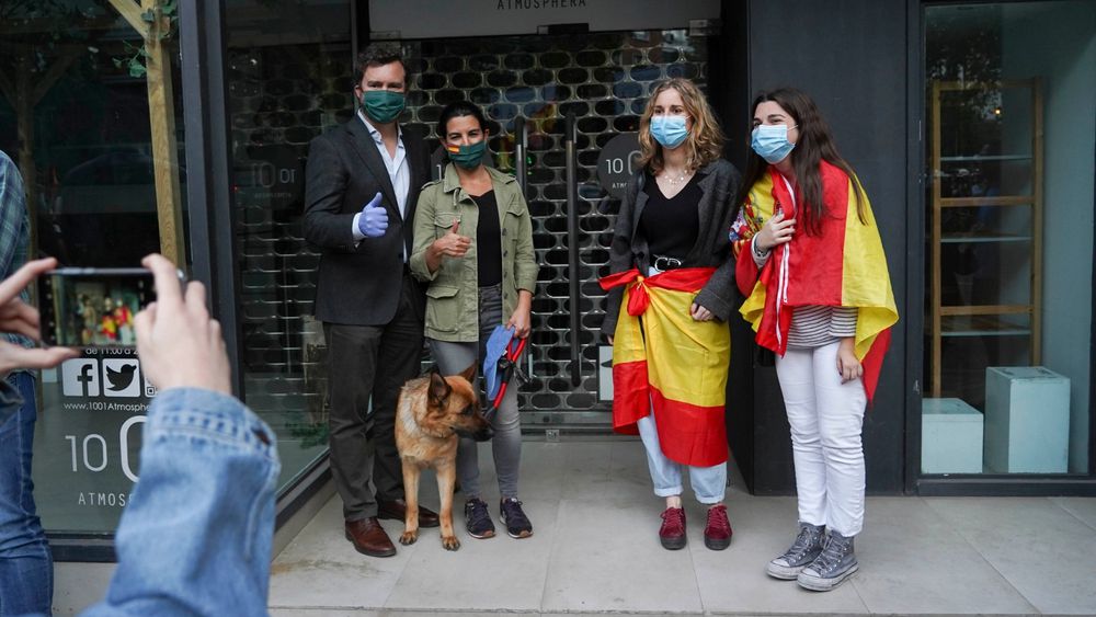 Iván Espinosa de los Monteros y Rocío Monasterio, con dos jóvenes que les han pedido una foto durante una protesta contra el Gobierno en paseo de la Habana, en Madrid, en mayo.Luis De Vega Hernández