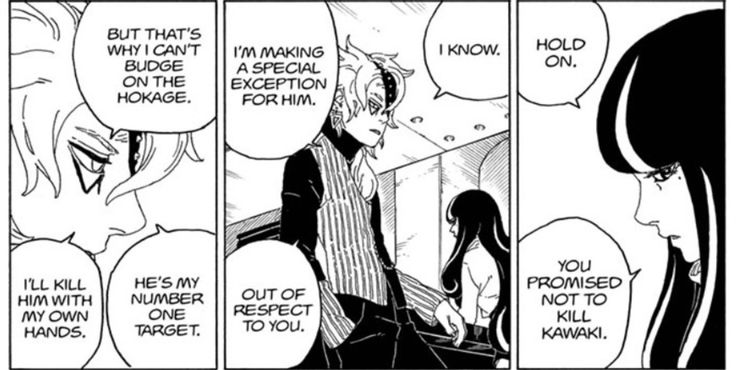 En el capítulo 59 de Boruto, Code le dice a su compañera y compañera de Kara, Ada, que no puede perdonar a Naruto y que él mismo matará al Hokage.