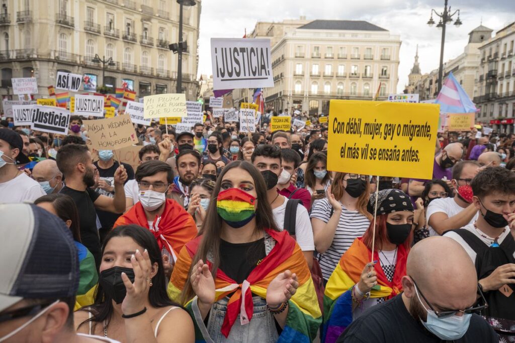 Alicia Ramos, activista trans, ha leído el comunicado de la convocatoria: “Sentimos abandonados nuestros derechos por las instituciones, que no están tomando medidas para protegernos y están descuidando u olvidando las políticas LGTBI. Reclamamos que se apruebe de una vez la ley LGTBI estatal y la ley trans [están fusionadas en una sola norma que está en fase de tramitación]”, ha denunciado. Entre los manifestantes se encontraba Sandra Pérez, una joven bisexual de 20 años. “La gente ya tenía discursos de odio, pero ahora tendrán más excusas para justificarlos. Sentimos miedo, pero estamos aquí precisamente para luchar contra él”. Coincide Maribel Torregrosa, activista trans de 64 años: “Dejemos de culpabilizar a aquella persona que por una mala reacción, una falta de no saber cómo reaccionar ante una situación que se le fue de las manos, hizo esto. Es importante mantener las convocatorias e incrementarlas”.