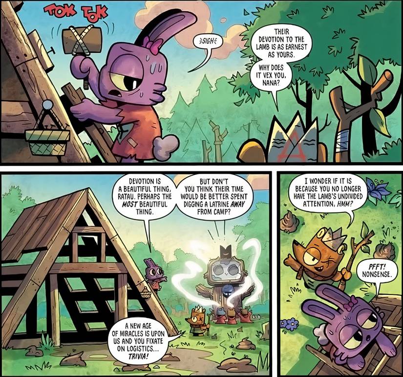 En el cómic, Lamb rescata a otra criatura, una conejita llamada Nana. Ella está feliz con una vida de libertad en el bosque, pero la corona roja en la cabeza de Lamb impulsa su deseo de devoción. Cuando regresan con más creyentes y una Piedra del Mandamiento, para doblegar los caprichos de los cultistas a los de Lamb, Nana los rechaza y huye. De esta manera, El cómic se basa en la mecánica de los “disidentes” en las filas del culto. Dentro del juego, los disidentes aparecen cuando no se satisfacen las necesidades de los cultistas, pero esto convierte su aparición en un giro de trama satisfactorio que funciona.