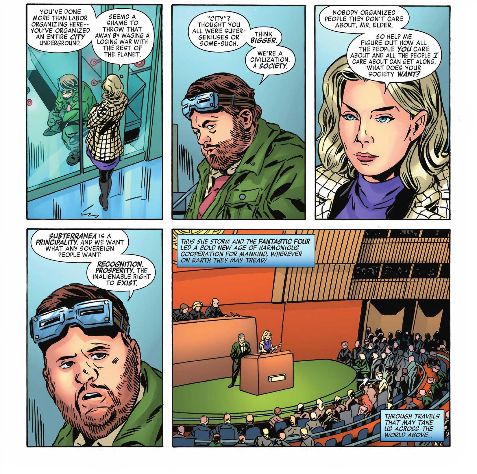Mientras el Cuatro fantásticos es un equipo de superhéroes, no se trata solo de vencer a los supervillanos. Todos quieren hacer que el mundo sea más agradable para todos. Nada muestra que mejor que Susan use su influencia política para obtener subterranea. por el resto del mundo. La fuerza de la mujer invisible no proviene de su poder, sino su disposición a luchar por todos.