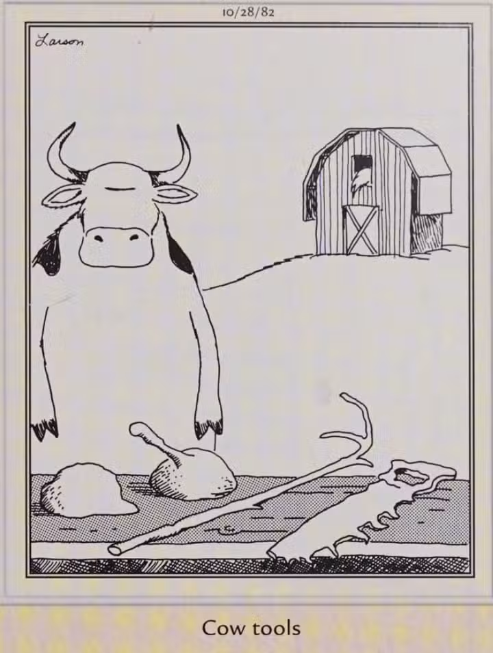 A pesar de su reputación, el remate de “Cow Tools” es simple: si las vacas fabricaran herramientas, serían primitivas y probablemente mal diseñadas. El chiste refleja la obsesión de toda la vida de Gary Larson por la antropología, la historia de la civilización y la línea divisoria entre el comportamiento humano y animal. Que es lo que lo convierte en un Far Side esencial, si no el “mejor” o el “más extraño”.