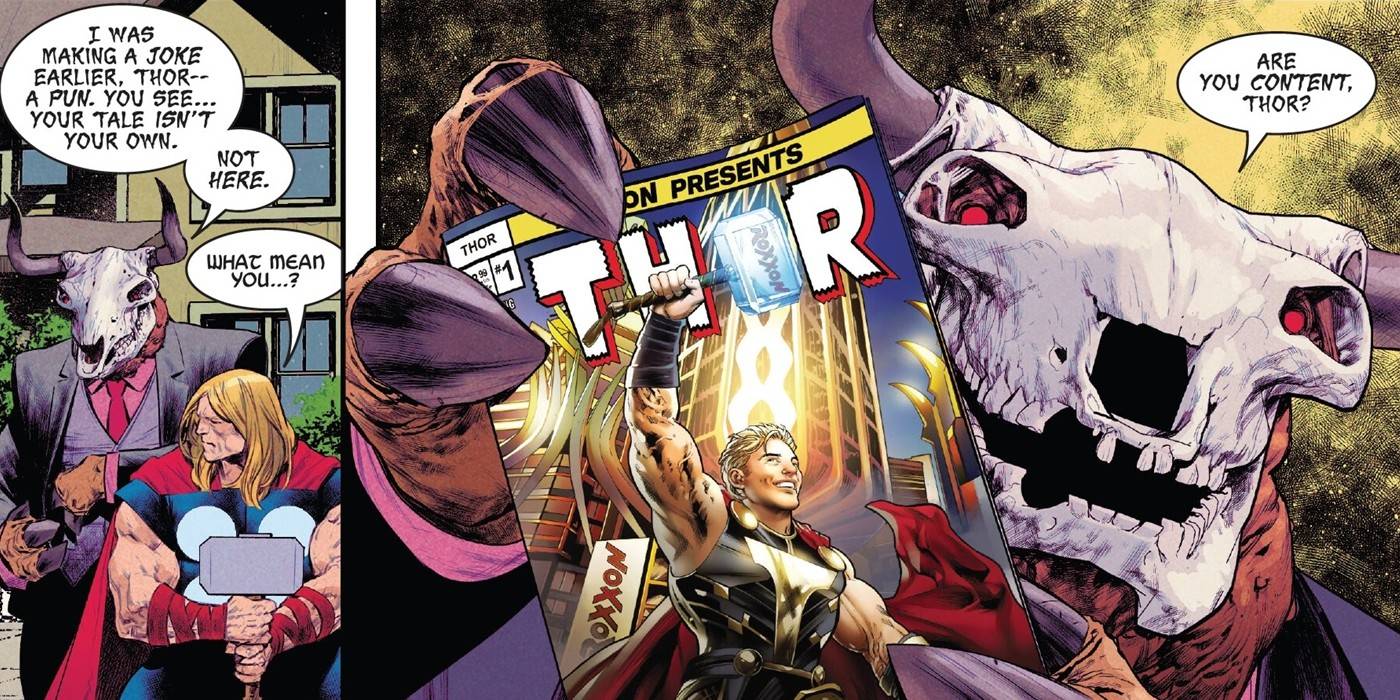 Agger luego le pregunta a Thor si “está contento”. La Hechicera luego le entrega a Thor un cómic protagonizado por él.