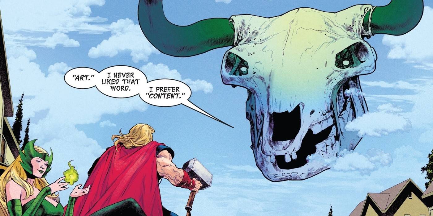 Esta etiqueta ha molestado a muchos artistas. Sienten que deshumaniza su trabajo y lo convierte en un bien más para ser explotado. Esta nueva etiqueta también coincidió con el auge de las franquicias de películas de gran éxito basadas en IP, como el MCU. Thor inmortal El número 9 destaca la relación entre arte y comercio.