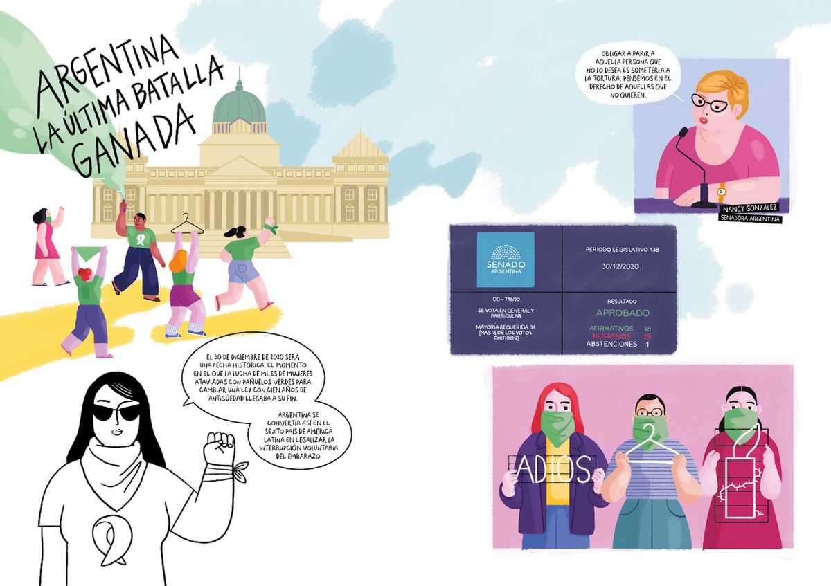 La práctica del aborto, por ejemplo, está documentada desde al menos la época de la antigua Roma. “Es algo que ha sucedido y va a suceder siempre, sea legal o no”, afirma Elizabeth Casillas, guionista de La palabra que empieza por A. “Sin embargo”, completa Higinia Garay, la ilustradora, “aunque [en países como España] esté legalizado, sigue siendo un tema tabú. Por ejemplo: solo ahora se está empezando a hablar de abortar en clínicas públicas [en España, la mayoría de los abortos se derivan a clínicas privadas concertadas]. Por eso queríamos arrojar luz”. El resultado es un libro generosamente didáctico, cargado de sentido del humor, pero sobre todo de información valiosa (y, recalcan las autoras, difícil de conseguir) que aclarará algunas ideas a “aquellos que no hayan asumido un discurso feminista” sobre el aborto. “Parece que cuando se habla de mujeres el público tiene que ser femenino, pero para poder leer de Latinoamérica no tienes que ser latinoamericano”, reclama Garay. “Además, es profundamente machista decir que no lees algo porque es cosa de mujeres”.