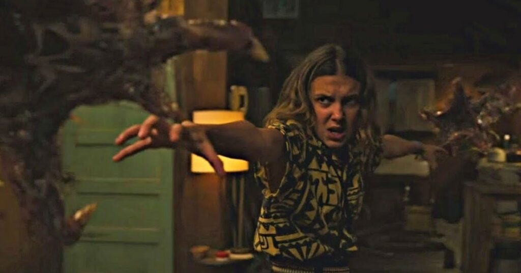Le preguntamos a Koda el truco más desafiante de la temporada: “Todo. Es un espectáculo muy difícil de hacer. Es mucho trabajo y mucho tiempo que pasamos ensayando y preparando. Quiero decir, esa es la belleza de lo que pasamos. Agregó: “La sala de sauna era muy divertida y súper desafiante. Shawn Levy estaba dirigiendo ese episodio y está muy al tanto de… Tienes que estar muy preparado cuando disparas con él. Y todo salió según lo planeado. Fue un reto porque Dacre [Montgomery], que interpreta a Billy, estaba en topless. Así que volándolo cuando Eleven lo está lanzando y esas cosas, tuvimos que crear estas plataformas salvajes e interesantes para que volara, y su doble de acrobacias tuvo que chocar en cosas y cosas así sin una camisa. Eso fue divertido y desafiante. La cabaña de Millie cuando el Mindflayer la lleva al techo, toda esa secuencia fue muy divertida. Los hermanos Duffer tocan esta música y meten a todo el mundo en ella, y es muy divertido”.