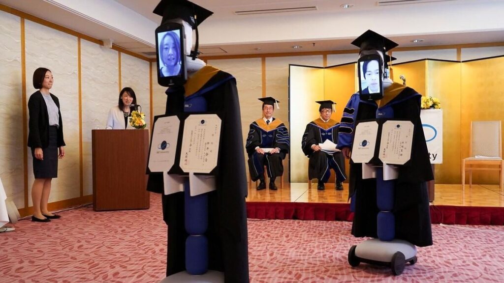 Los robots fueron ataviados con togas y birretes de graduación para la ceremonia que tuvo lugar en el Hotel Grand Palace de Tokio. Los «rostros» de los robots eran tabletas que mostraban la cara de los graduados, que estaban conectados desde su casa, y a través de sus ordenadores portátiles controlaban a sus robots.