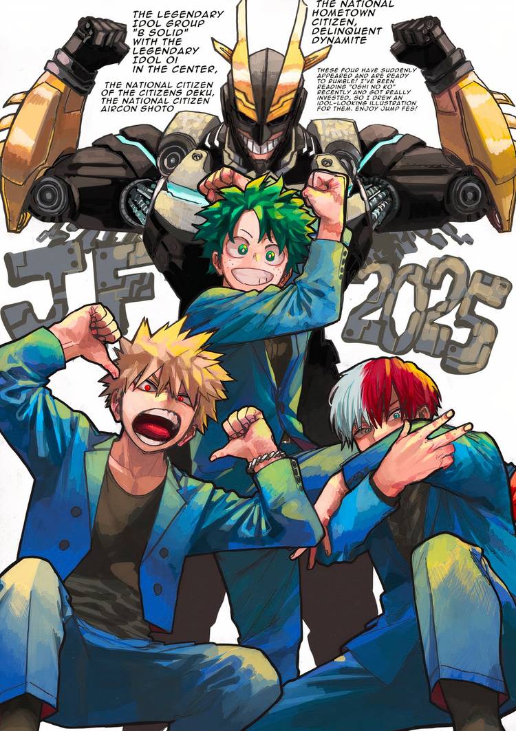 La divertida ilustración de Horikoshi, publicada en la cuenta X de @aitaikimochi, incluye algunos de mi héroe academia Los héroes favoritos de todos los tiempos de los fanáticos.: All Might, Deku, Bakugo y Todoroki. En la imagen, los personajes aparecen como un grupo ídolo, con los estudiantes de la Clase 1-A vestidos con camisas negras, chaquetas azules y pantalones azules, mientras All Might está detrás de ellos como el punto focal con un traje robótico negro y dorado. . El divertido dibujo, creado específicamente para Jump Festa 2025, es un homenaje a los héroes más populares de la serie, al mismo tiempo que los ubica en un nuevo y alegre escenario de universo alternativo con nuevos y elegantes atuendos que difieren de su atuendo típico de héroe.