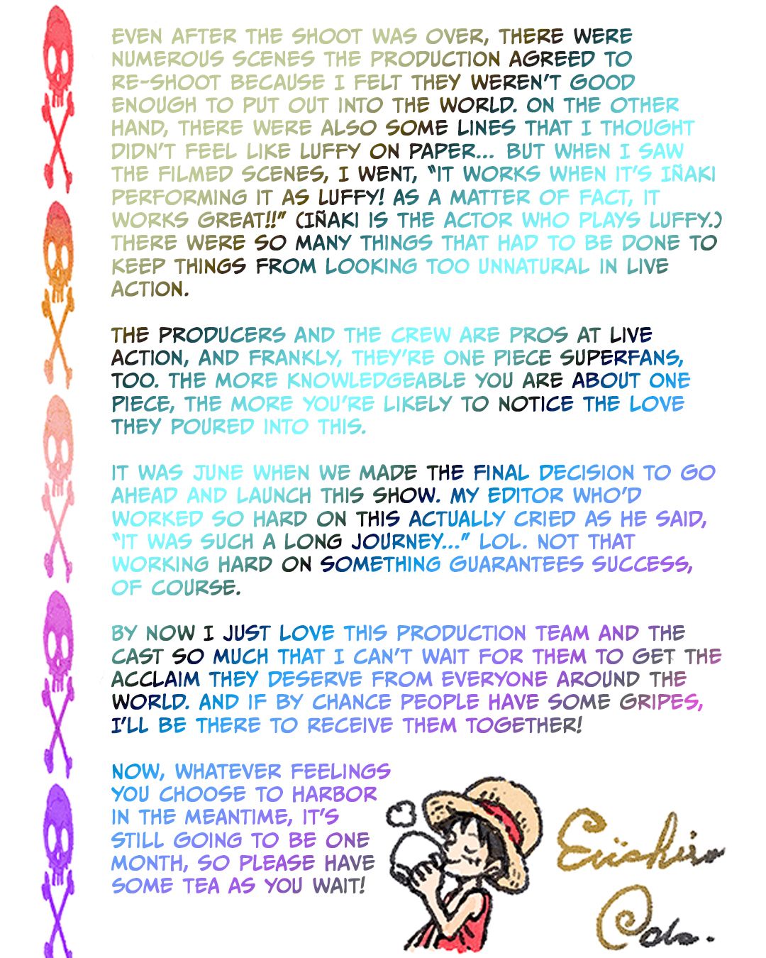 Coincidiendo con el panel de la Comic-Con 2023 de San Diego del programa, Netflix publicó una emotiva carta de Una pieza el creador Eiichiro Oda reflexionando sobre el próximo programa de acción en vivo.