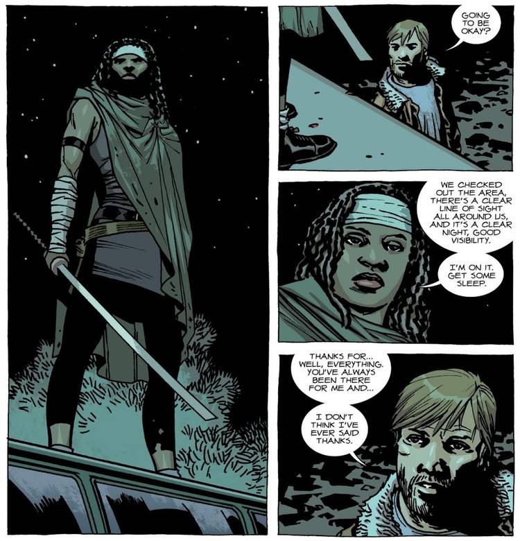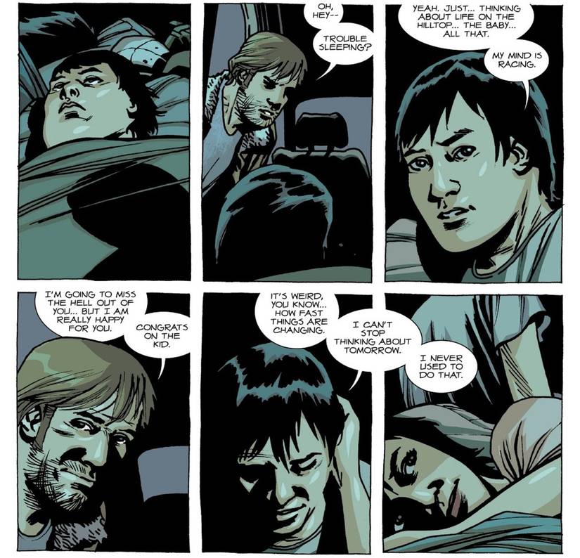 Quedan algunos rastros del plan de Kirkman, por ejemplo Rick agradeciendo a Michonne por su apoyo en una escena que enfatiza cuán vital se ha vuelto su amistad para el grupo. Asimismo, hay un momento en el que Rick le advierte a Carl que se ponga el cinturón de seguridad, lo que podría interpretarse como un presagio de su seguridad. Sin embargo, como señala Kirkman, el plan de Glenn de mudarse a una nueva comunidad con Maggie lo convierte en el claro objetivo de muerte. Cuando Kirkman tuvo una segunda oportunidad en la televisión, se convirtió en un genio nuevo decisión de oscurecer el estatus condenado de Glenn.