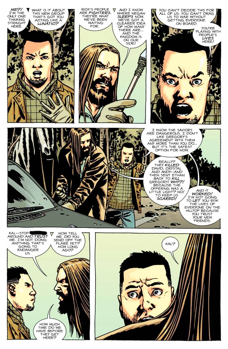 En Los muertos vivientes #110, que el De lujo Edition presenta una reimpresión a todo color de, hay una escena de diálogo acalorado entre los residentes de la colina Jesús y Kal, que termina con un ejemplo de la marca registrada de Robert Kirkman “Momento de turno de página“Estilo, lo que lo llevó a recordar su desacuerdo con Erik Larsen sobre su efectividad. Llega al final de una página pesada de diálogo, por la que Robert Kirkman encuentra un” fuera “al tener la atención de Kal desviada por algo fuera de panel, sus ojos se abren de horror en lo que ve, un momento por delante del lector.