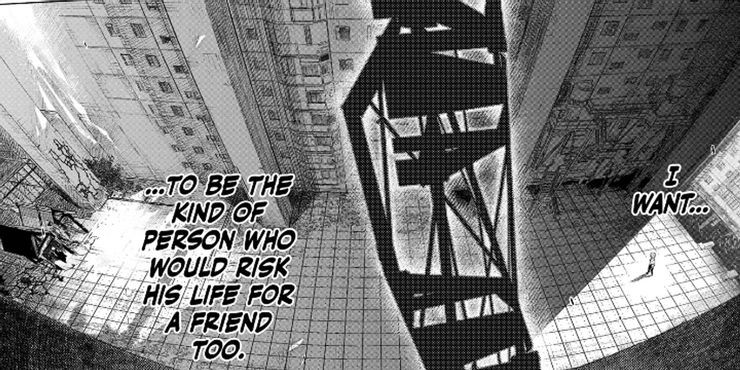 Esta dinámica se perdió por completo en Terror en tokyo ya que Hide nunca quiso convertirse en un ghoul ni estaba celoso del poder de Ken. Su prioridad número uno era asegurarse de que Ken estuviera bien. El hecho de que incluso usara una máscara cuando asumió la identidad de Scarecrow ejemplifica aún más su desinterés. Este fue el momento en el que la atención de todos se dirigió a él, pero en lugar de disfrutar del centro de atención, optó activamente por ocultar su verdadero yo, haciendo que sus intenciones de ayudar a su amigo Ken Kaneki fueran aún más puras. Mientras tanto, Azuma fue originalmente el héroe en choujin x pero perdió ese estatus. Ahora sufre de un gran vacío en su vida que una vez estuvo lleno, que es peor que si siempre estuviera vacío. Además, el deseo de Azuma de convertirse en el tipo de persona que arriesgaría su vida por un amigo es revelador porque esencialmente desea la gloria. No está diciendo que quiera proteger a Tokio, por ejemplo. El hecho de que termine su admisión con “también” disminuye la posibilidad de que quiera ser desinteresado por el hecho de ser desinteresado. Se siente excluido.