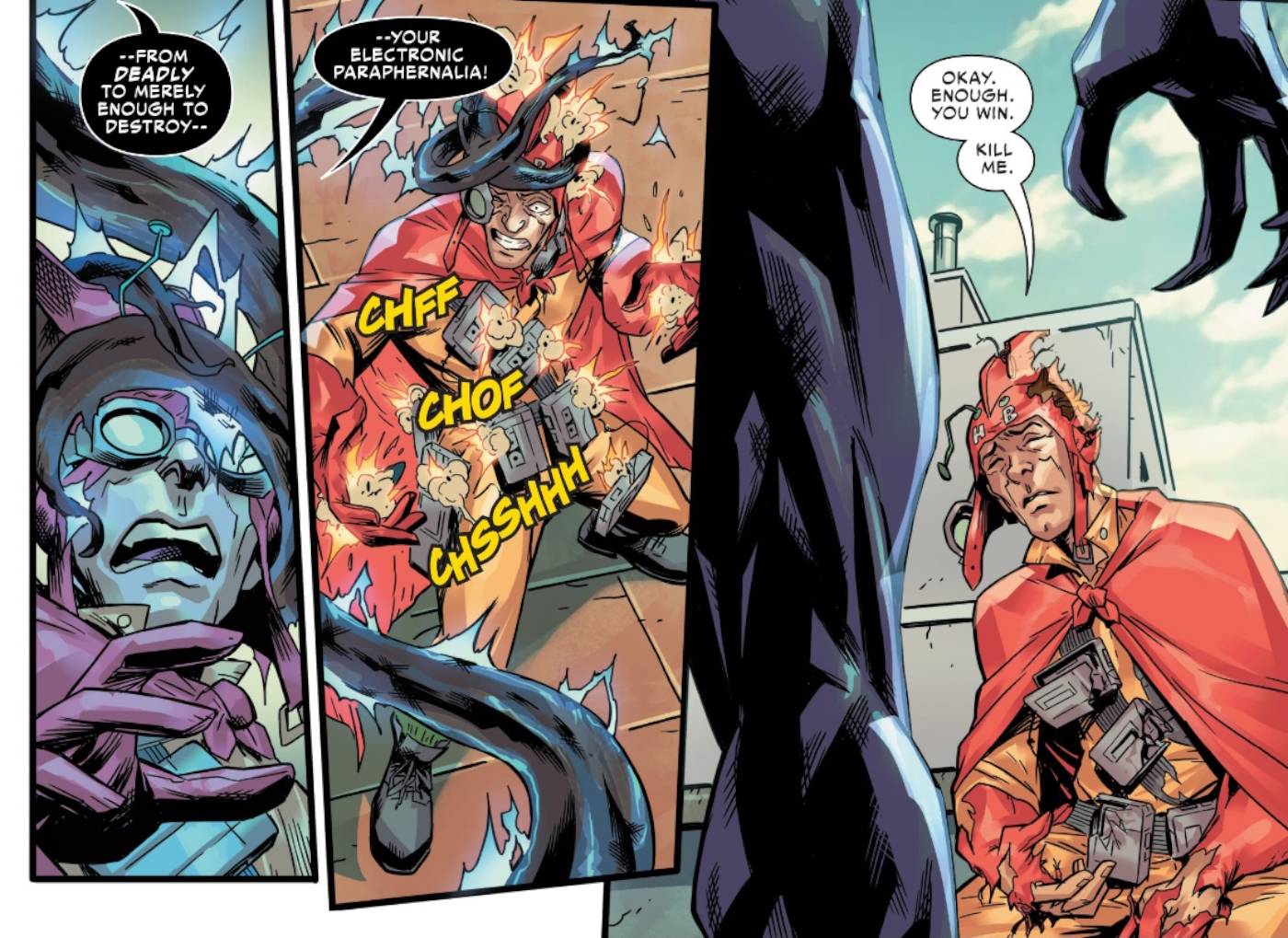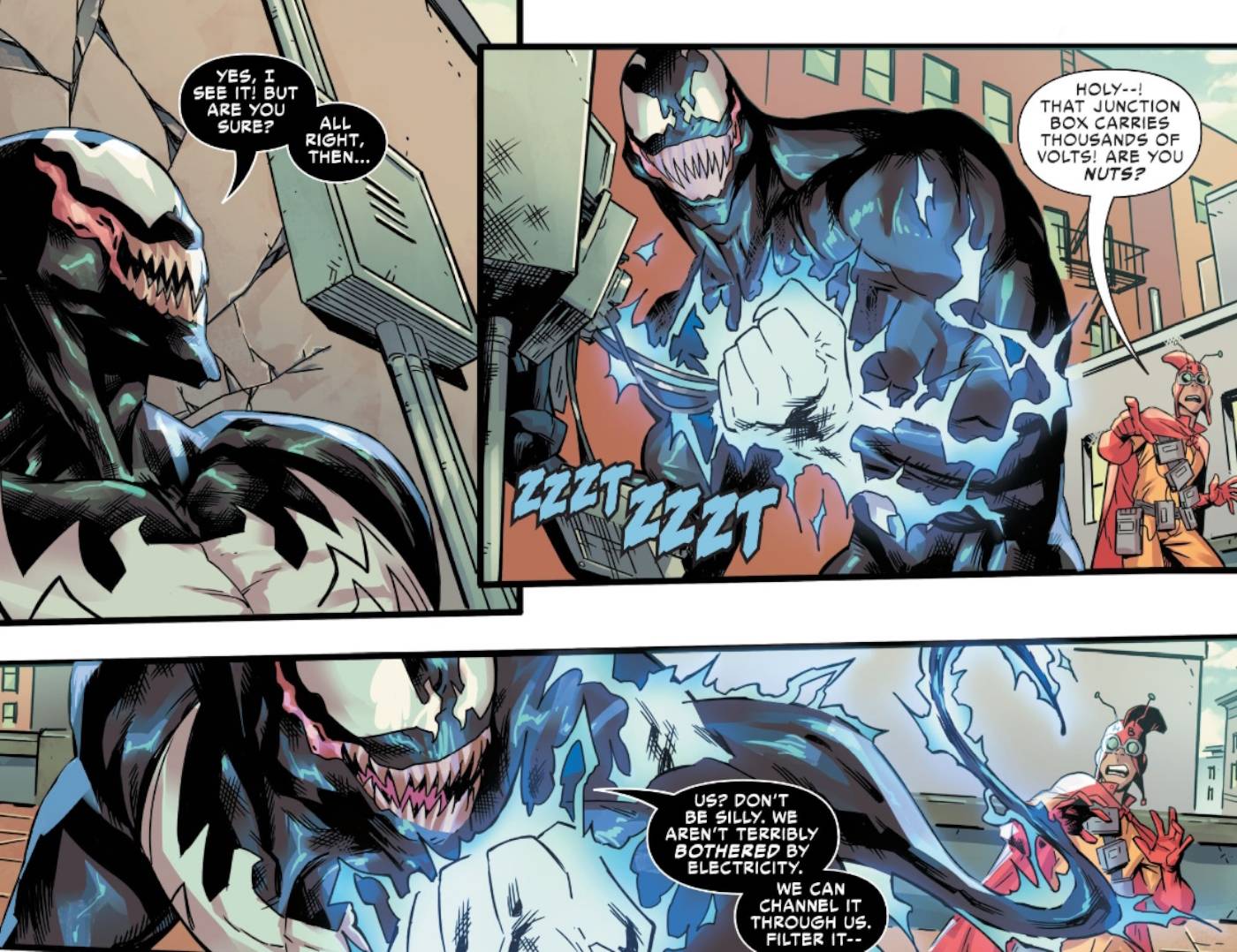 La sorprendente y olvidada superpotencia de Venom se mostró en 2022 Veneno: Protector letal #2 de David Michelinie e Ivan Fiorelli. En este número, para lidiar con un villano llamado Humbug que depende de la tecnología, Venom abre una caja de energía y absorbe la electricidad de ella. Luego lo redirige hacia el criminal.