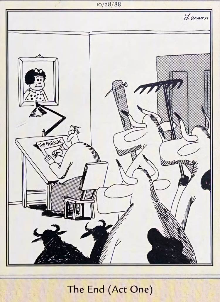 Es decir, en cualquier medida que fuera socialmente transgresora, esa transgresión fue un esfuerzo de colaboración. Gary Larson podría haber estado empujando los límites como creador, pero a su vez, Una generación de editores de periódicos también estaba presionando, al incluirlo en sus publicaciones. Esto, a su vez, fue una respuesta al apetito en ascenso por el humor más extraño y vanguardista entre los lectores.