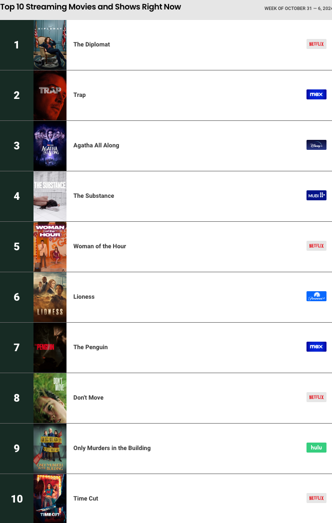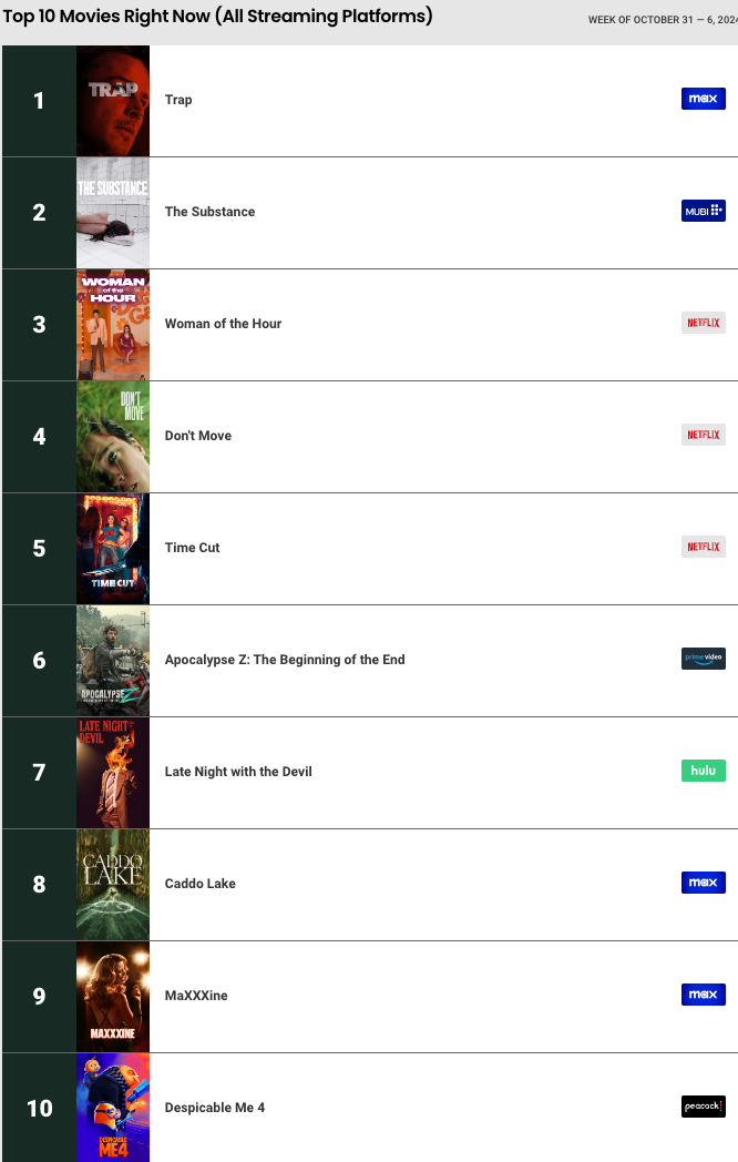 Ahora, el creciente éxito de las películas de terror de 2024 continúa teniendo éxito en Mubi, un servicio de transmisión dedicado a mostrar películas ambiciosas de cineastas visionarios. La sustancia ocupa el cuarto lugar en las “10 mejores películas y programas en streaming” de Reelgood y el segundo en sus listas de “10 mejores películas” para la semana del 31 de octubre al 6 de noviembre. M. Night Shyamalan Trampatransmitida en Max, fue la única película que se vio más en streaming la semana pasada. Consulte los gráficos completos a continuación: