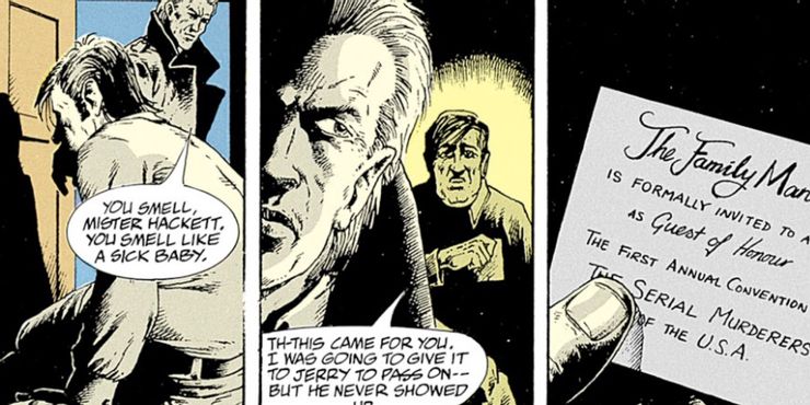 En Hellblazer #28, John Constantine está tras la pista del Family Man, un asesino en serie que solo tiene como objetivo a las familias, asesinándolas brutalmente. Family Man estaba encontrando víctimas a través de un amigo de Constantine y cuando John lo ayudó sin darse cuenta, se encargó de librar al mundo de Family Man. Siguió un juego del gato y el ratón entre los dos, y durante la persecución, John descubrió la invitación de Family Man a la convención de asesinos en serie que se ve en hombre de arena #14¡donde fue uno de los Invitados de Honor!