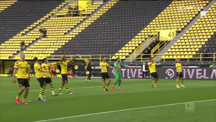 El fútbol de élite volvió este sábado con la reanudación de la Bundesliga, que dejó imágenes y momentos para la historia. Uno de ellos sucedió al término del Borussia Dortmund-Schalke 04, cuando los jugadores locales simularon el agradecimiento a la afición a pesar de que el encuentro se disputó a puerta vacía.