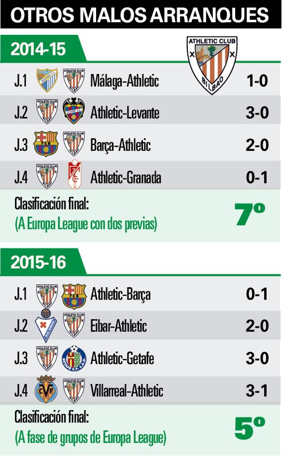 En la campaña 2014-15, con Ernesto Valverde en el banquillo rojiblanco, el Athletic inició la Liga con un partido perdido ante el Málaga (1-0) y a pesar de que después de impusieron al Levante en San Mamés (3-0), en las siguientes dos jornadas encadenaron sendas derrotas contra el Barça (2-0) y el Granada (0-1). Así, después de los cuatro primeros partidos del campeonato el cuadro rojiblanco ocupaba la decimocuarta posición, a diferencia de ahora que es decimonoveno. La explicación es que en estos momentos hay equipos con más puntos que los bilbaínos debido a que han disputado un partido más que ellos y, por tanto, han quedado relegados a una zona más trasera de la clasificación.