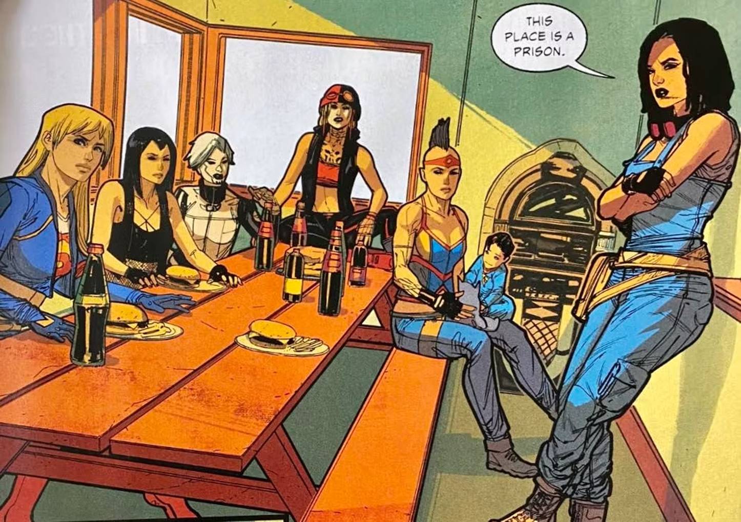 Seis de las damas de Garaje de la ciudad de Gotham, junto con un bebé Superman, siéntese en Martha’s Diner & Malt Shop, donde Lucius y Luke Fox hablan sobre su entorno. Natasha Irons, también conocida como Steel, les dice a los Fox que, aunque esta ciudad parece pintoresca, es una prisión de la inexistencia de la que se debe escapar si es posible.