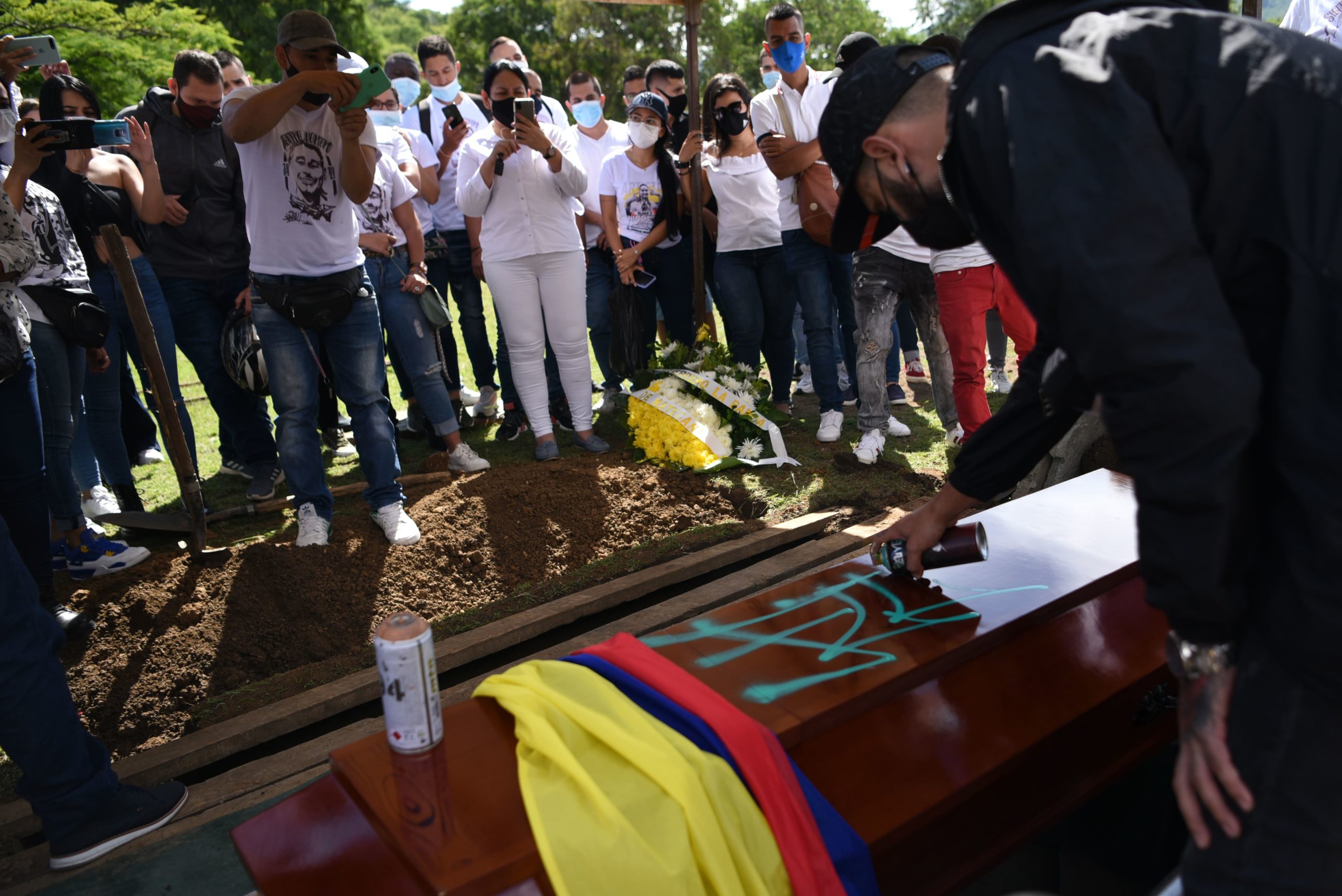 Nicolás Guerrero, de 22 años y primo del alcalde de Cali, fue asesinado el 2 de mayo mientras rendía homenaje a otras personas muertas en medio de las protestas. Sus amigos y familiares lo despidieron con grafitis en su ataúd. Crédito: Archivo Amnistía Internacional / Christian EscobarMora