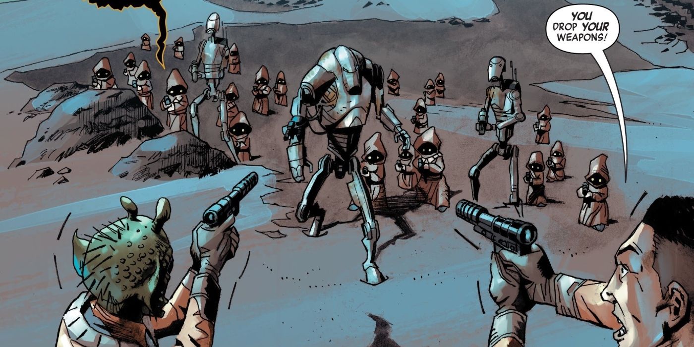 En Star Wars: Era de la Rebelión – Jabba el Hutt por Greg Pak, Emilio Laiso, Roland Boschi y Marco Turini, un equipo de asaltantes intenta invadir un campamento Tusken y robar un vino muy caro hecho por los mismos Tuskens. Sin embargo, estos dos ladrones no fueron los únicos que tuvieron esta idea, ya que un Comandante Imperial y su escuadrón de Storm Troopers también llegaron a la emboscada establecida junto con otro grupo más: los Jawas y los Battle Droids que controlan. Cuando los tres grupos separados convergieron en el mismo lugar (orquestado por Jabba the Hutt por poco más que una risa), todos se enfrentaron entre sí, siendo los dos bandos opuestos principales los Storm Troopers y los Battle Droids en una escena que recordaba inquietantemente a las Guerras Clon.