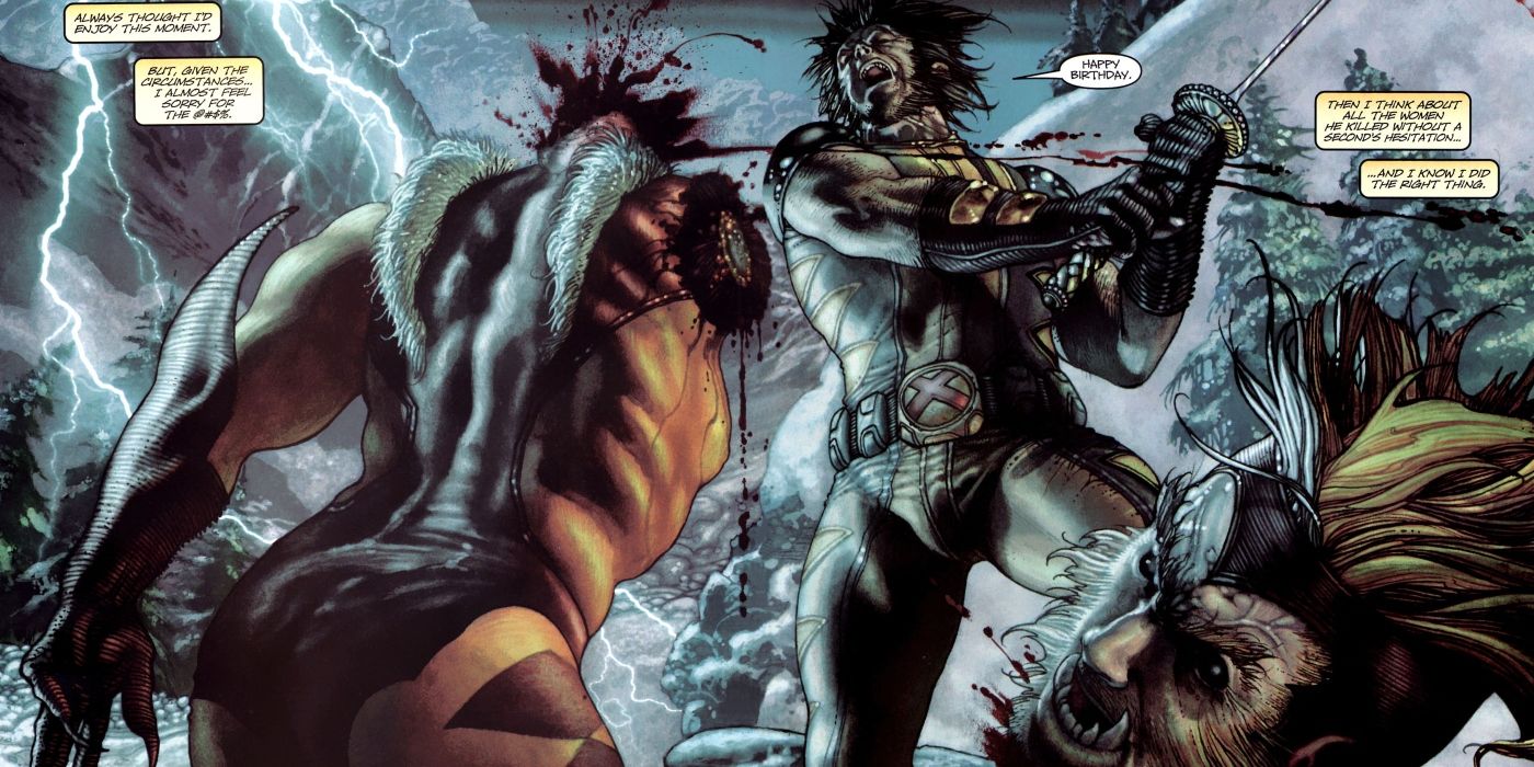Como una bestia con la mente vacía, Sabretooth intentó volver a colocarlo, pero después de que Wolverine le explicó que eso no funcionaría, Sabretooth aceptó su destino. Con lágrimas en los ojos, Víctor le pidió a Logan que lo matara y Wolverine accedió con una rápida decapitación. La brutalidad aquí no se debió a la acción detrás de la violencia, sino a la tristeza, la muerte.