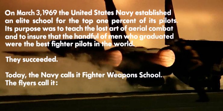 Otro aspecto de arma superiorLa apertura de que se destacó de manera destacada fue la carta de apertura, que describía el trasfondo de arma superior en lo que respecta a la vida real, relatando cómo la escuela real en la que se basa la película se formó el 3 de marzo de 1969 por la Marina de los EE. UU. El propósito de la escuela era enseñar el arte del combate aéreo al uno por ciento superior de los pilotos de la Armada, asegurando que sean los mejores pilotos de combate del mundo. La escuela de élite se llamaba originalmente Escuela de Armas de Combate de la Armada de los Estados Unidos, pero los pilotos la llamaban Top Gun. Hoy en día, el programa permanece, pero ha sido renombrado Programa de Instructor de Tácticas de Combate de Ataque de la Armada de los Estados Unidos (programa SFTI) y todavía se lo conoce extraoficialmente como Top Gun.